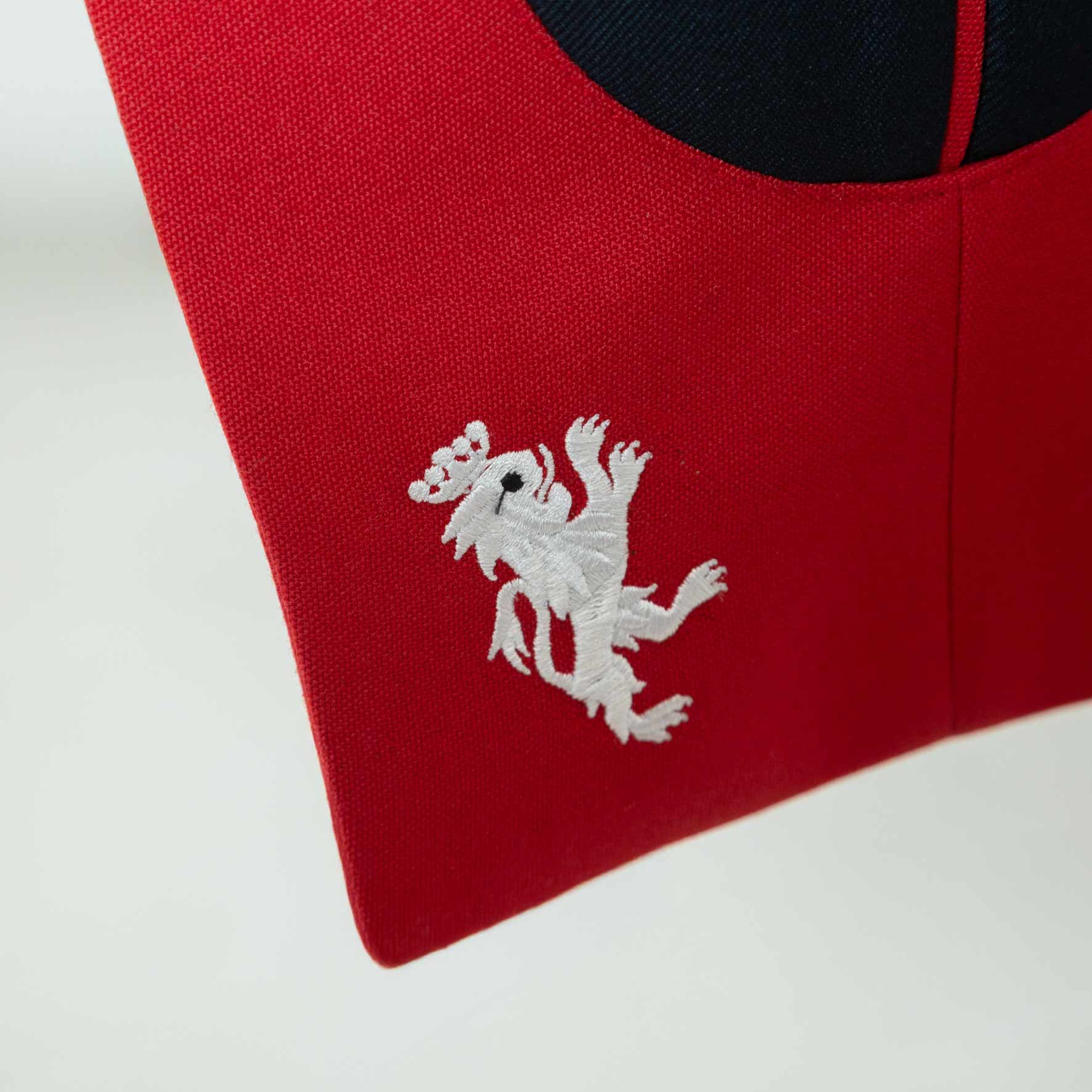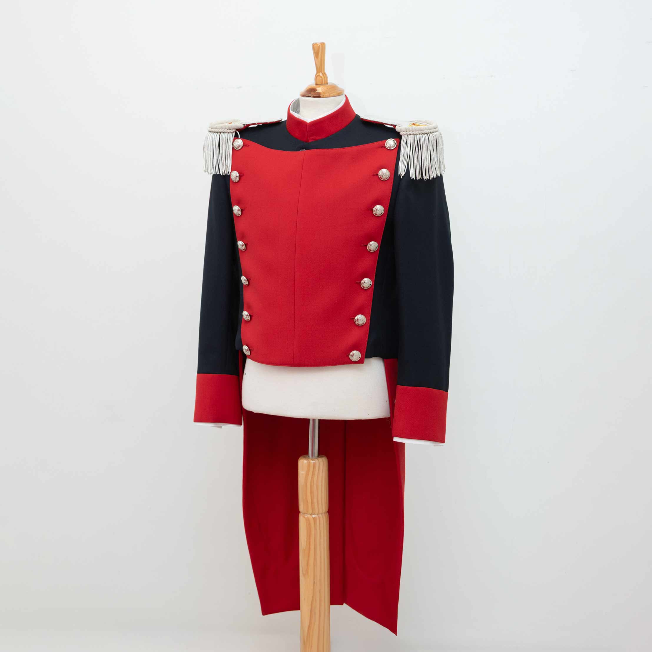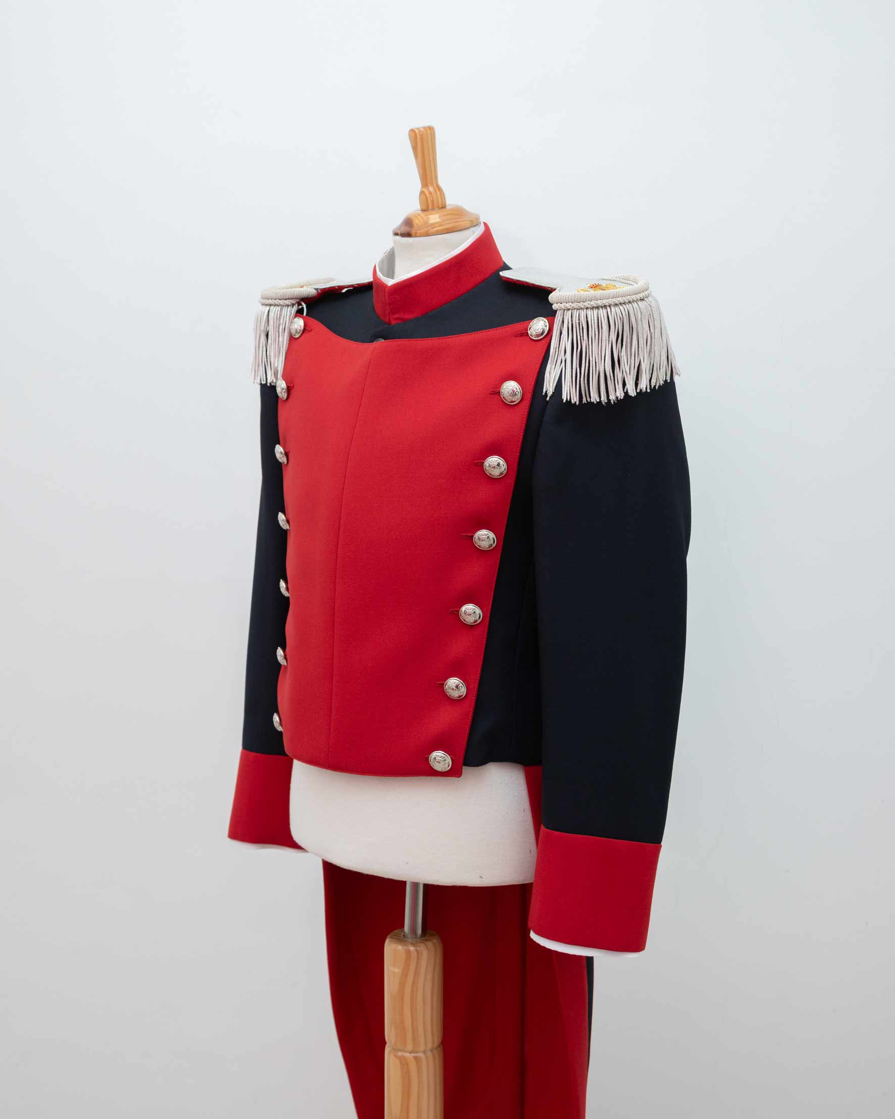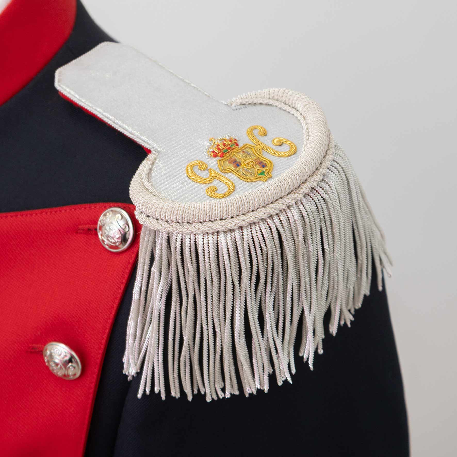 Confeccionado con materiales de alta calidad, incluye chaqueta en paño azul con pechera y puños en rojo ceremonia, botonadura metálica, y hombreras con fleco. El conjunto se completa con el pantalón en rojo, siguiendo la estética tradicional de gala.