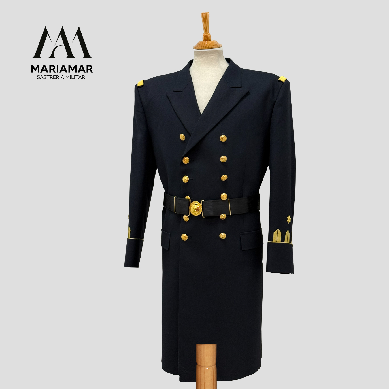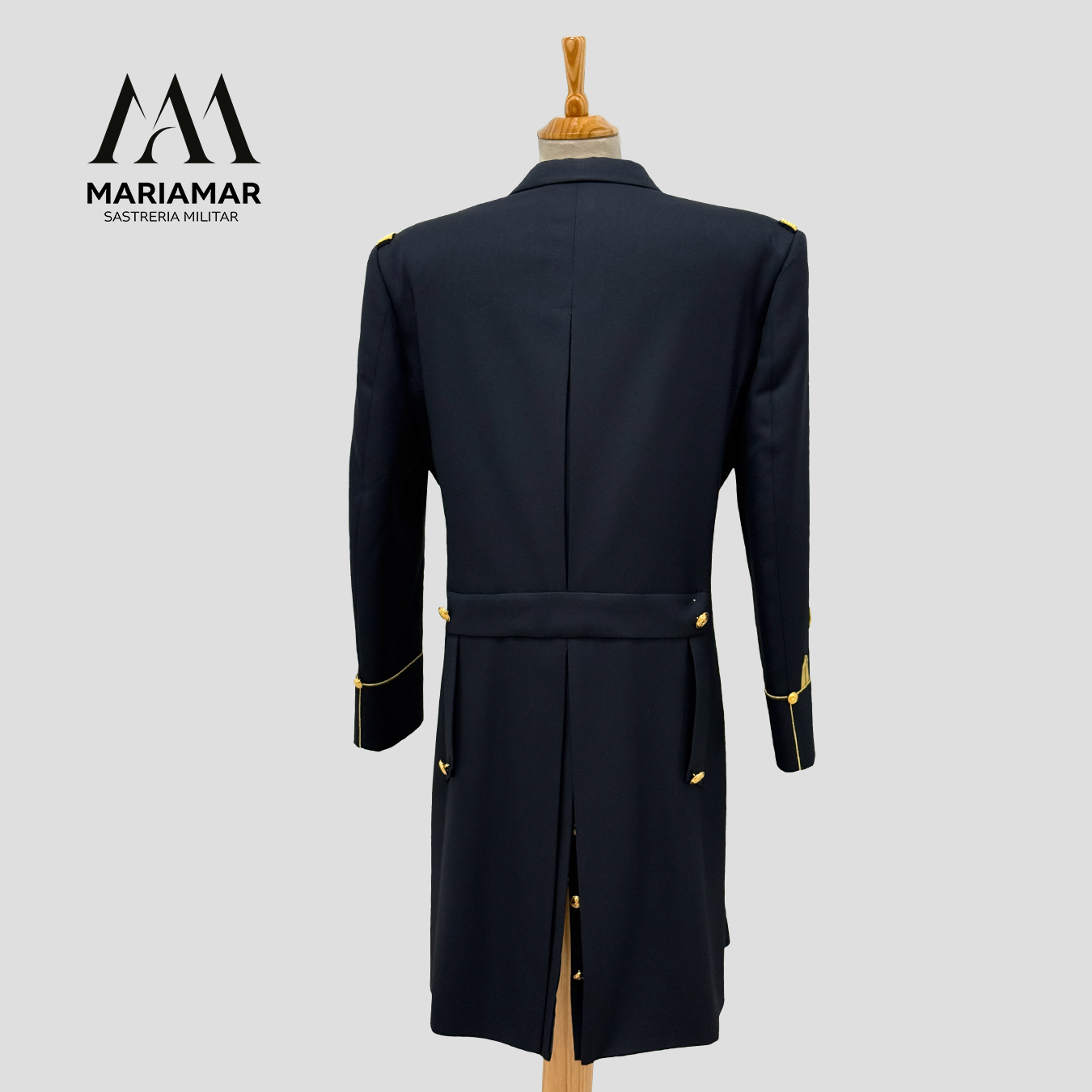 Levita de Infantería de Marina en paño azul marino, doble botonadura dorada y cinturón de gala. Bocamangas y hombreras con galones trabajados a mano para un porte impecable en ceremonias y actos oficiales. Diseñada y confeccionada a medida en Mariamar, con personalización de forros, largos y ajustes para un encaje perfecto.